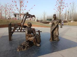 雕塑采用写实的手法,再现古代夫妻二人共同纺织劳作的场景,寓意夫妻共同努力,一起创造美好生活。明·赵弼《青楼隐者记》:“女织男耕;桑床满圃。”描述的就是在农耕时代的男女分工,一起打造平淡而质朴的生活与爱情。
