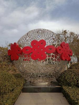 雕塑选用中国传统饰品平安扣的造型,从外型看它圆滑变通,符合中国传统文化中的“中庸之道”;平安两字寓意明了,表达了人们朴素美好的生活愿望。平安扣外圈是圆的,象征着辽阔天地;内圈也是圆的,象征内心的平宁安远。