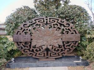 雕塑设计创意来源于汉代铜镜,整个雕塑以铜板镂空雕刻的手法体现。图案采用宝相花和回形纹,宝相花又称宝仙花、宝莲花,汉族传统吉祥纹样之一。隋唐以后宝相花广泛流行于织锦、铜镜以及瓷器的装饰上,含有吉祥、美满的寓意,也代表着对爱情的美好祝愿。