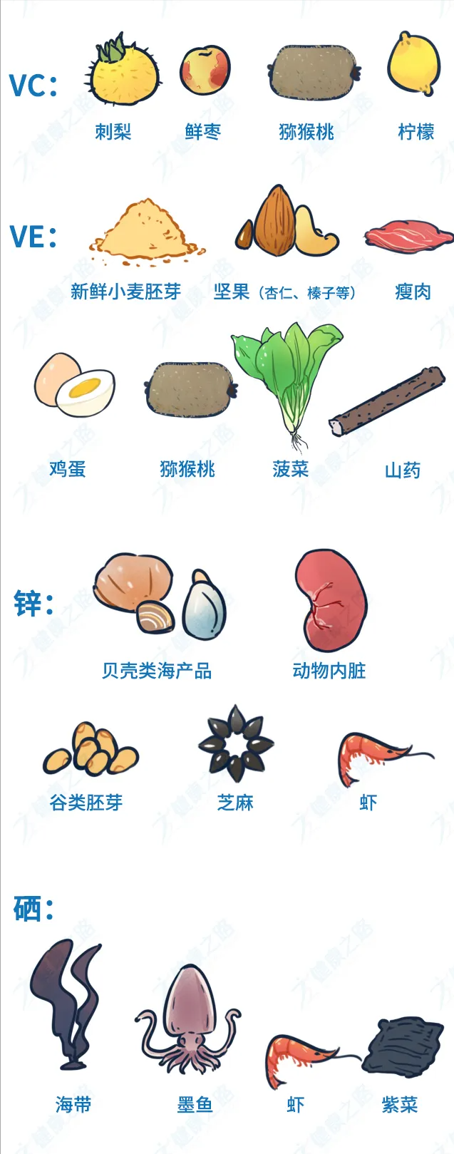 多吃富含维生素C和E以及含锌、硒较高的食品:
