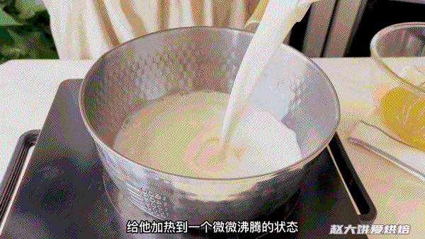 2,牛奶和淡奶油倒入小锅中,小火煮至微微蛋糕冒气泡后离火。