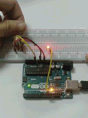 当我们旋转滑动液晶器线,打开信号串口监视器,可以看到调光上智能面的数值在改变,面包板的LED亮度大小也跟着改变,pwm是什么信号,当数值变大,LED变亮,当数值变小,LED变暗。