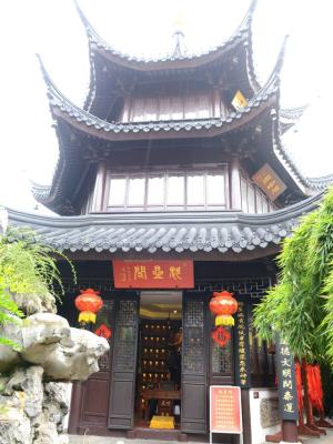 走到长廊的尽头,有一小空地,空地上堆放着一些太湖石,同时建有一座魁星阁。