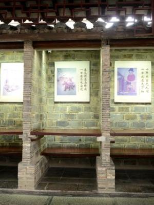 屏风的后方则是“南闱放榜”影壁墙,墙呈八字形,正中的位置乃是用现代手法绘制的放榜时的热闹场面。影壁的旁边有一铜雕,其形个县象乃是负笈赶考。