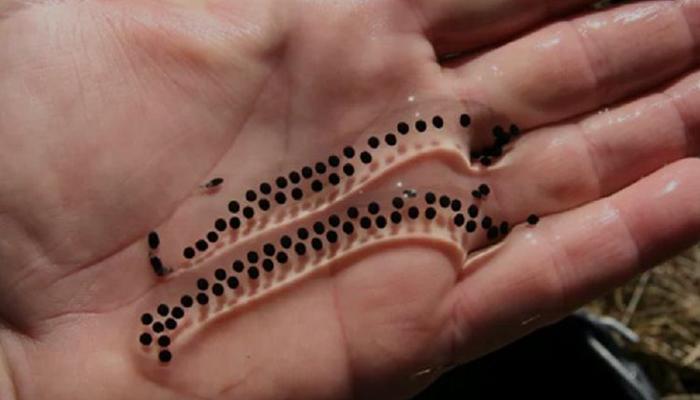 蟾蜍卵与青蛙卵的区别是,青蛙的卵由卵胶膜包围形成单独的小球形,再集合成一团团的卵块。如果卵结成的卵块是一团一团的,这就是青蛙的卵。如果许多卵成一条连续的线状长带,带内的卵排成两行,像一串珠子似的 ,这就是蟾蜍的卵。