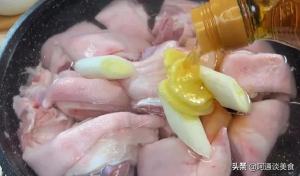 第二步:锅内倒入清水,将猪蹄放入锅中,加入料酒,葱片,姜片。大火煮五分钟,然后捞出清洗干净,备用。