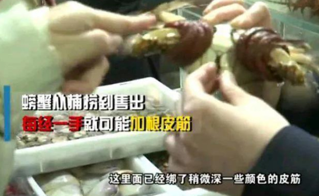 一说起螃蟹,我们总会想起它美味的口感,细腻的肉质,每年到了螃蟹上市的季节,就会有大批钟爱者购买螃蟹,商家也会抓住这样一个契机,实施垫物加称。近日,在福州就有多个农贸市场在出售螃蟹,但仔细观看螃蟹会发现在螃蟹身上绑了好几条十分粗大的红皮筋,消费者要购买螃蟹都会连同皮筋一起称重。