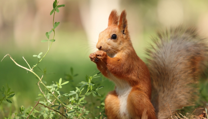 松鼠属啮齿目松鼠科动物。泛指一大类尾巴上披有蓬松长毛的啮齿类动物。松鼠喜欢吃素,偶尔也吃荤,素食主要以红松、云杉、冷杉、落叶松、樟子松和榛子、橡子的干果以及种子为主,荤食主要以昆虫、幼虫、蚁卵和其它小动物等为主。在食物青黄不接的情况下,松鼠另有选择。春季吃树芽,夏季吃蘑菇、托盘和越桔等浆果,到了秋季食物极大丰富。