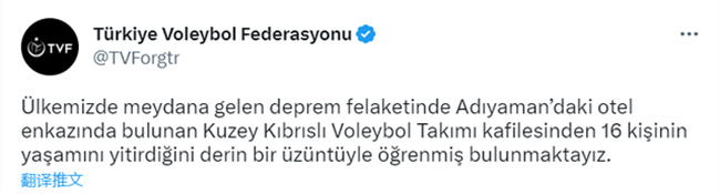 2月11日凌晨,土耳其排球联合会在官方推特上发布消息,受到严重的地震灾害,阿德亚曼酒店在地震中坍塌,救援队在废墟中找到了北塞浦路斯女子排球队的16名队员,全部遇难。排球队员大多数都是十几岁的孩子,却将生命永远暂停在了最灿烂的年华。