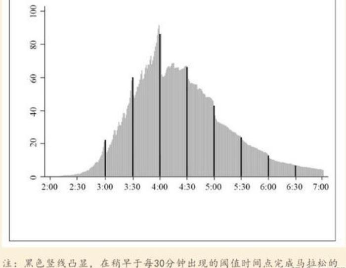 研究者发现一个现象:马拉松跑者的用时大多集中在整点,尤其4小时的时候非常明显,形成了尖峰,这就是里程碑效应。大家眼看离整点将近,就会激发最后的能量,加油冲刺一把。3小时59分和4小时01分,虽然没有能力上的差异,但前者在心理上更有满足感。