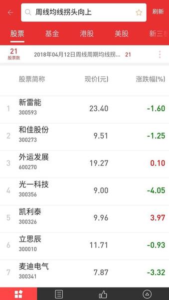 技术选股,最好在第一步选中的基本面个股里再进行技术选股。也可以直接进行技术选股,以同花顺手机软件为例,可以先入主页的"问财选股",点击进入"快速选股",下拉页面,可以看到有一个"技术指标",输入自己的条件参数,我选择"周线均线拐头向上",然后点击"开始选股",选出21只个股,可以直接点击查看k线,也可以存入自选股。