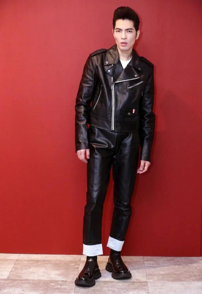 看萧敬腾的这个发型就能让造型显得很多,加上整体的色调和衣物版型的选择,单看造型的比例,身高171的他穿出了180的效果。