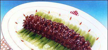 3.勺内加白汁,油热用葱烹锅,加糖炒出香味,再加鸡汤和调料,放入梅花参烧沸,改为小火烧煨。靠至汤汁约剩100克时,取出梅花参放盘中间。勺内汤汁用淀粉勾汁,淋入椒油,浇在梅花参上。