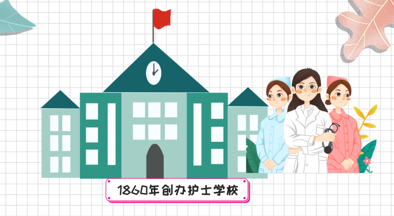 1860年,她在英国伦敦创办了世界上第一所正规护士学校。她的护士工作专著,成了医院管理、护士教育的基础教材。国际护士理事会为纪念南丁格尔为护理事业做出的贡献,于是将她的生日5月12日定为“国际护士节”,也称“南丁格尔日”。