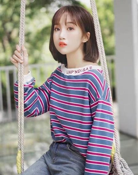 再比如下图这身穿搭,简单的条纹上衣,大派学院其实非常浓郁的BOBO头,给人的第一印象就两个字,清纯!