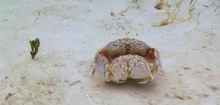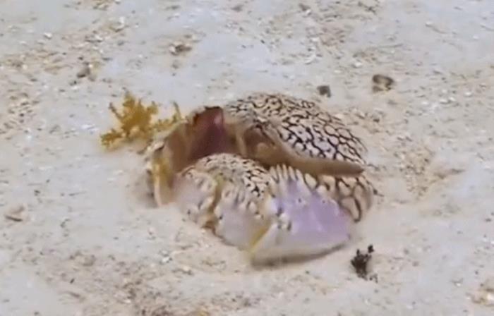 国外一个网友在海底潜水时,拍摄到了一个非常好玩的画面。潜水者将一对馒头蟹从海底沙子中扒拉出来,使其暴露在开阔地面上,感受到危险的雄性馒头蟹抱着老婆一路狂奔,之后找到了一个自认为安全的地方,将老婆放下来,保护着老婆埋入海底沙子中隐藏自己。