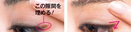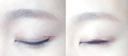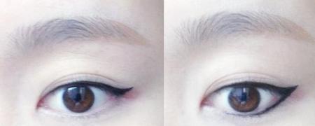 细细的眼睛想变成圆圆的杏眼怎么办?闭上眼,刚才上翘眼角的最高点是外眼角斜上方(左图)。把眼睛中间的外眼线画粗一些即可(右图)。
