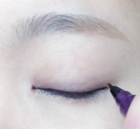不画内眼线只画外眼线,眼球和眼线中间有留白。只画一笔。