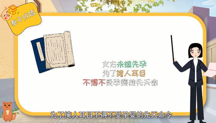 奉子成婚一说出自中国古代命理学著作《滴天髓》,意思是:女方未婚先孕,为了掩人耳目不得不受孕婴的先天命令而立即举行完婚仪式。