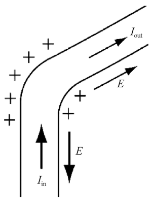 在这里,我们要澄清一个比较容易被误解的点:一些同学学习到电流和电路这一章节的时候,将其与之前所学的静电场的内容完全割裂开了。通过上述的欧姆定律,我们清晰地看到:在电路中驱动电荷做定向流动的是静电场E与单位电荷所受的方法非静电力f这两者;而在一般的电路中,非静电力仅在电源内部(内电路)存在。因此在整个外电路中,驱动电荷运动的只是义和静电场本身。这个静电场是哪里来的呢?答案其实非常有意思,它与我们在初中第一次学习电路时就知道的一个事实“稳恒电路中同一根导线中的电流处处相等”息息相关。设想如图1所示的一段电路,如果一开始流入拐角处的电流大于流出的,即Iin>Iout,则根据电荷守恒,会有正电荷在图中拐角处积累。这样一来,累积起来的正电荷就会产生一个方向向外的电场,累积的越多则电场越强。从图中可以看出,这个电场在流入电路的部分与电流方向相反,减小了单位电荷所受的合力,而在流出电流的部分与电流方向相同,增大了单位电荷所受的合力。根据上述的欧姆定律,我们立即知道随着电荷的累积,流入的电流会逐步减小而流出的电流会逐步变大,直到二者相等,则电荷不再累积,电流也不再变化,电路达到稳定状态。在实际的电路中,静电场几乎无处不在,其来自于在电路中积累的电荷,反馈式地调节着电路中各个部分的电流大小。