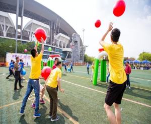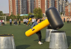 【比赛规则】:2-4个小组同时进行比赛,起点线到终点线的距离约为10米,每组派1人拿着大锤。从起点出发,到达终点后将吹好的气球全部打破,用时最短的小组获胜。