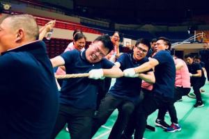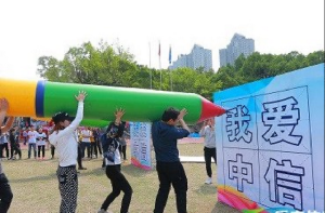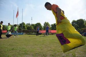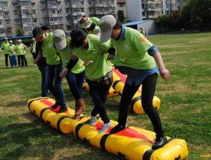【比赛规则】:团队成员两两组队将手臂搭成桥,另外一位队员辅助将大号T恤快速从第一个人身上脱下来,穿到第二个人身上。T恤依次在各成员身上穿一遍,统计完成时间。最快时间完成的团队获胜。