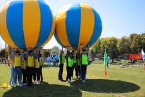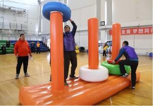 【比赛规则】:7名参赛队员每人拉住1根道具上的绳子,一起用力把充气鼓面拉起,剩下1名参赛队员控制球放在充气鼓面上方,比赛开始后,参赛选手通过控制绳子来使充气鼓垫球,垫球的高度至少在10公分以上,在规定3分钟时间内完成垫球次数多的名次列前。