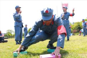 【比赛规则】:比赛开始前,每队10人按横排立于起点线后,分别将相邻队员的左右腿用绑腿套套在一起(套在踝关节附近)。听到发令后,10人同时走或跑向终点,以最后一名队员通过终点线为计时终止。用时少者名次列前。行进中所有相邻队员两腿自始至终要用绑腿套套在一起,如遇脱落,需在原地重新套好后才可继续行进,否则成绩无效。如中途有队员摔倒,待整理好后可继续行进。