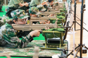 【比赛规则】:每位参赛选手采用立姿持枪,瞄准射向15米的靶位,每人5发子弹,击中靶位目标1次得1分,共5分。