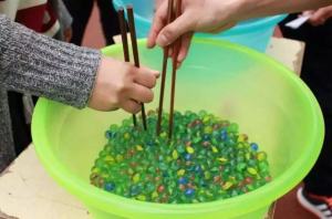 【比赛规则】:裁判员发出开始口令后,参赛队员用手中的筷子将大盆里面的弹珠一个一个的夹出来放入自己的框子内,在规定1分钟时间内自己框子内的弹珠数量多的名次列前。