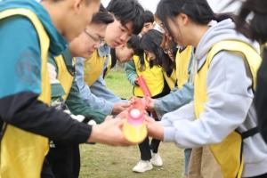 【比赛规则】:队员一字排开,第一杯水满杯,以口咬住杯子传递,完成后统计杯子里的剩余水量。在最后一位成员的杯子上做队号标记。在规定时间内被子里的水最多为获胜。