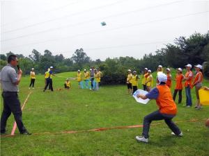 【比赛规则】:2-4个小组同时进行比赛,起点线到终点线的距离约为20-30米,中间设置2-3个障碍点,每组8-10人参赛。要求4-5名队员从起点出发,通过中间障碍点,于另外一组进行接力,总时间用时最少的队伍获胜!