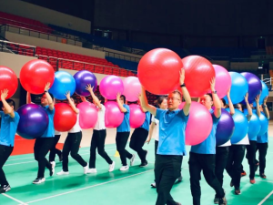 【比赛规则】:比赛开始前6人前后站立,每2人中间放1个健身球,比赛的每人举起1个健身球,比赛开始后,不得用双手碰触人间的球,在球不落地的情况下进行前进到达30米终点,用时少的名次列前,中途落地1次加时2秒,原地捡起继续比赛,故意落地取消成绩。