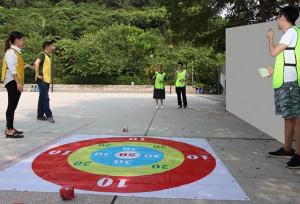 【比赛规则】:2-4个小组同时进行比赛,沙包和地标之间距离5-8米,每组5个沙包,进行投掷,小组累计分数最高的队伍获胜。