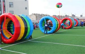 【比赛规则】:比赛开始前,6名队员立于起点线处,每人一个充气圈,圆柱器材立于对面20米处,裁判发令后,队员通过依次滚动充气圈前往器材区域并将充气圈套进圆柱上快速返回接力其他队员,每次只能1人进行比赛,每人只能移动一个圈,先放大圈后放小圈,直到所有圈全部套进柱子后结束。