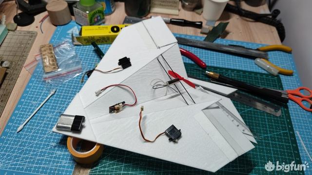 2.三角翼混控,正确的反馈是遥控拉杆两边舵面朝上,推杆两边舵面朝下;遥控往左推杆,左舵朝上右舵朝下,往右则相反。如果不一步是折这样折纸,则需要在遥控里调整一下舵机三个的反相