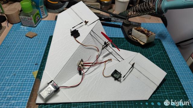 粘上舵机大全,马达和接收机接好,把折纸接收机粘到机身上