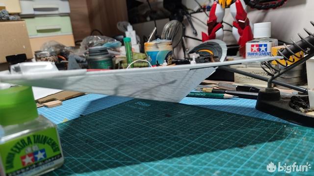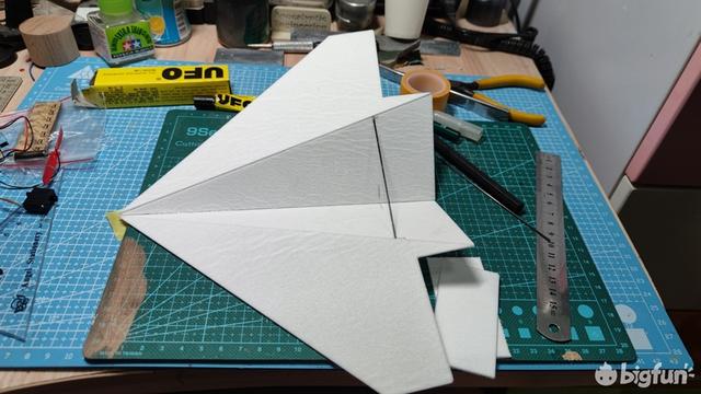 两片舵面挑一个长边用裁纸刀切出斜面UFO(压在桌边会比较好操作),这样做是为了给舵面的向下活动留出空间