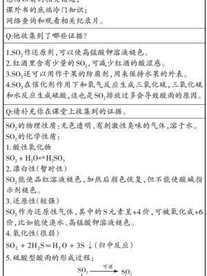 设计意图:本节课的是什么重点是SO2的化学性质和硫酸型硫酸雨的形成过程,二氧化硫的性质教案,难点是SO2在不同环境下表现出的多重性质。从预习结果来看,大部分学生对学习重点把握较好,时间计划适宜,但课前收集的证据太少、较片面,不足以支撑知识结构的完善。本环节意在促使学生自主学习,独立完成任务,在没有教师的指导下制订学习目标、学习计划,回顾学前知识。在课前让学生自己准备和制订目标,可加深学生的学习主体体验,加速课堂教学的进程,有利于培养学生思考问题的习惯。
