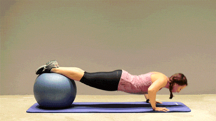 可利用瑜伽球做下斜俯卧撑,将双脚搁放在球面上,双手撑地做各式俯卧撑,能侧重锻炼上胸肌。