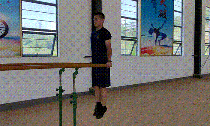 在双杠上做臂屈伸抗阻力锻炼,可锻炼胸肌、三角肌前束以及肱三头肌。