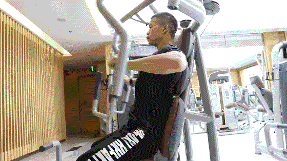 可利用坐姿推胸器做肩臂的向前推送的屈伸动作,强化胸肌和肱三头肌。