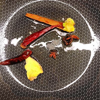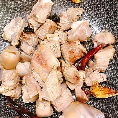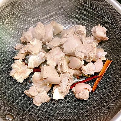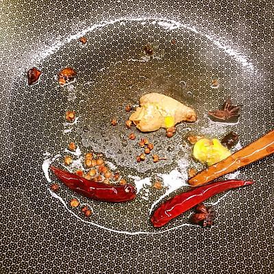 10、锅中放油烧热炒香生姜、山奈八角桂皮干辣椒羊肉