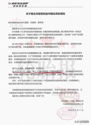 2022年8月17日,住友橡胶(中国)有限公司邓禄普轮胎销售有限公司发布“关于整合邓禄普轮胎中国业务的通知”,全文如下: