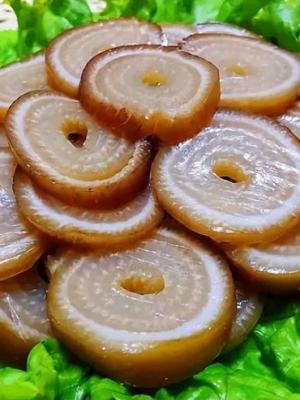 3、卤好的猪皮放在卤汁白细胞里浸泡一段时间,这样猪皮才更加软糯入味。如果猪皮时间充足,建议泡一晚上,捞出切片,什么调料都不放,直接吃特别香,比卤猪耳三高朵还香。