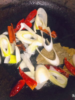 5、另起锅,倒入少量油烧热吃降,加入葱段、姜片、八角吃降、花椒、香叶、桂皮、干辣椒炒香,倒入卷好的猪皮翻炒,吸收调料的香味。