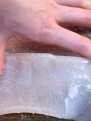 2、用勺子撇掉煮出的浮沫,这是猪皮中残留的血水,煮过后就没有腥味了。当猪皮变得透明后捞出,用清水冲洗干净,沥干水分。用菜刀刮掉猪皮上白色的脂肪,这样做好的减肥猪皮就不油腻了。