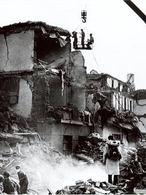 幸存下来的市民满身都是灰尘,愣愣地看着自己的家变成了一地废墟。