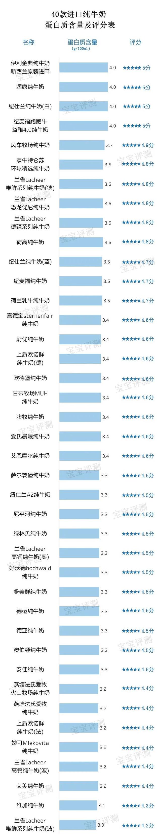 以每天喝400ml牛奶来计算,40款进口纯牛奶可提供的蛋白质含量在12g-16g之间。