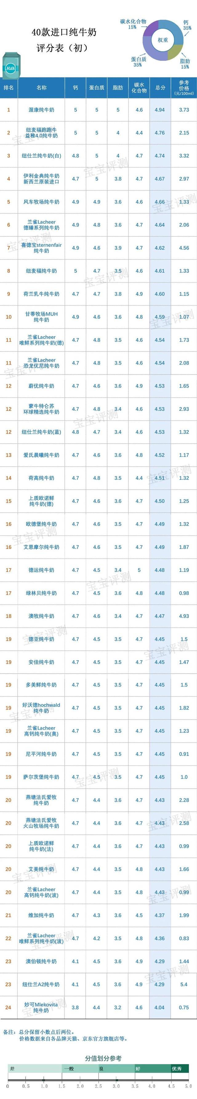 仅从营养成分表标识来看,40款进口纯牛奶营养价值的最终得分及排名情况如下: